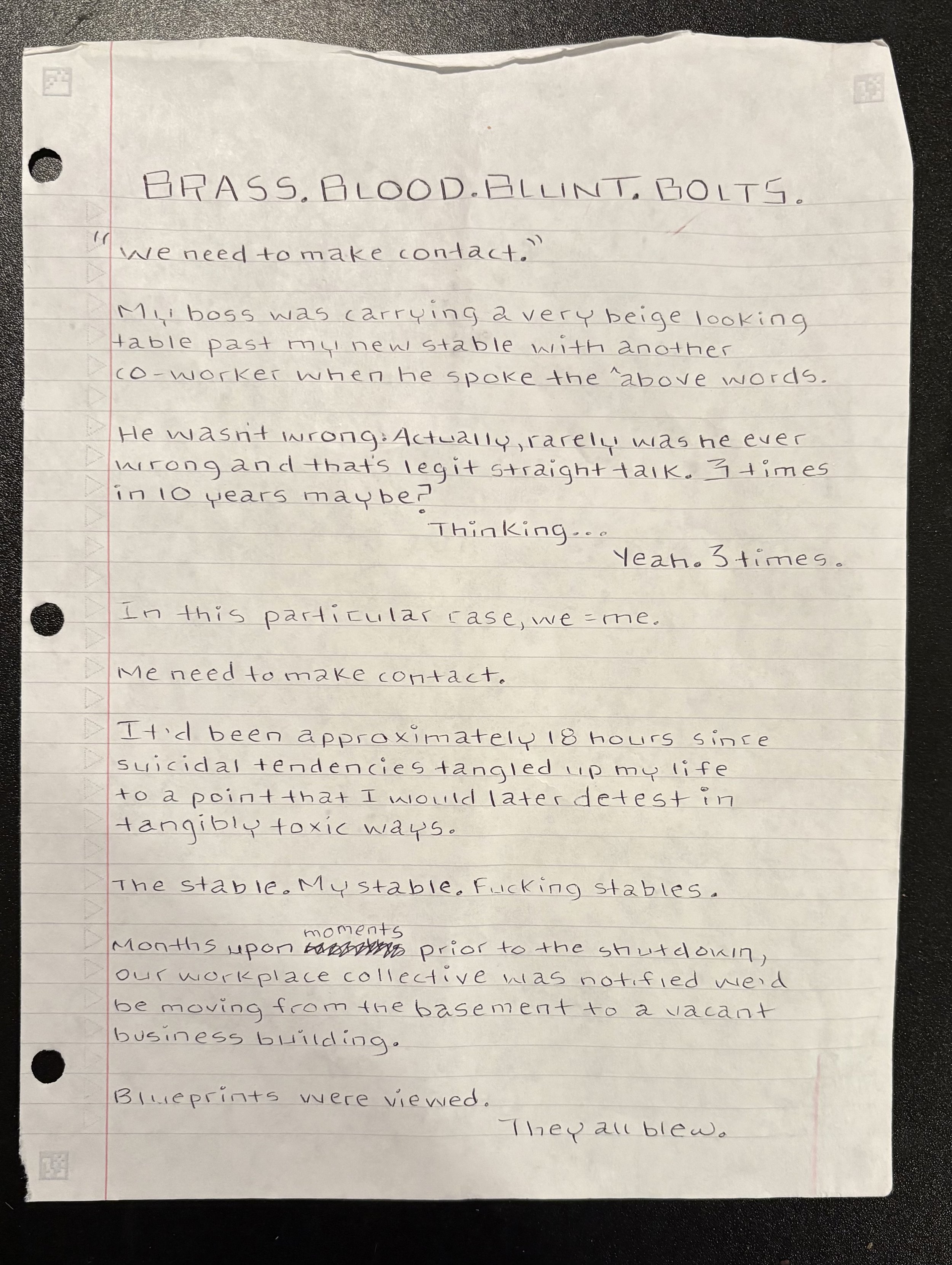 And then the self-destructive wheels that have nothing to do with one’s own preservation kicked back into gear. Maybe it was the sound of mechanistic trash compacting. Maybe it was the sound of something else entirely. 19 hours in. What I had done?